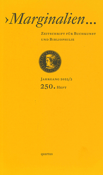 | Marginalien, Heft 2 / 2016 (Nr. 221, Vorzugsausgabe). Zeitschrift für Buchkunst und Bibliophilie. Hrsg. von der Pirckheimer-Gesellschaft. Bucha, quartus 2016. Gr.-8°. 102, (2) S. mit Abbildungen + 8 S. typograph. Beilage (Buchdruck), OKlappenkart. Tadellos. * Mit einem beilieg. Orig.-Holzschnitt „Stehender Akt“ von Wolfgang Leber, auf Bütten gedruckt u. vom Künstler signiert. – Aus dem Inhalt: Edwar Goreys verschrobene Bildgeschichten; Zum Tod von Otto Rohse; Dreißig Jahre Quetsche; Der Dichter Max Hermann-Neiße; Graphik-Novels über Gulbransson, Munch u. Schwitters. – Typograph. Beilage: Max Herrmann-Neiße: Joseph Roth. Erstdruck.