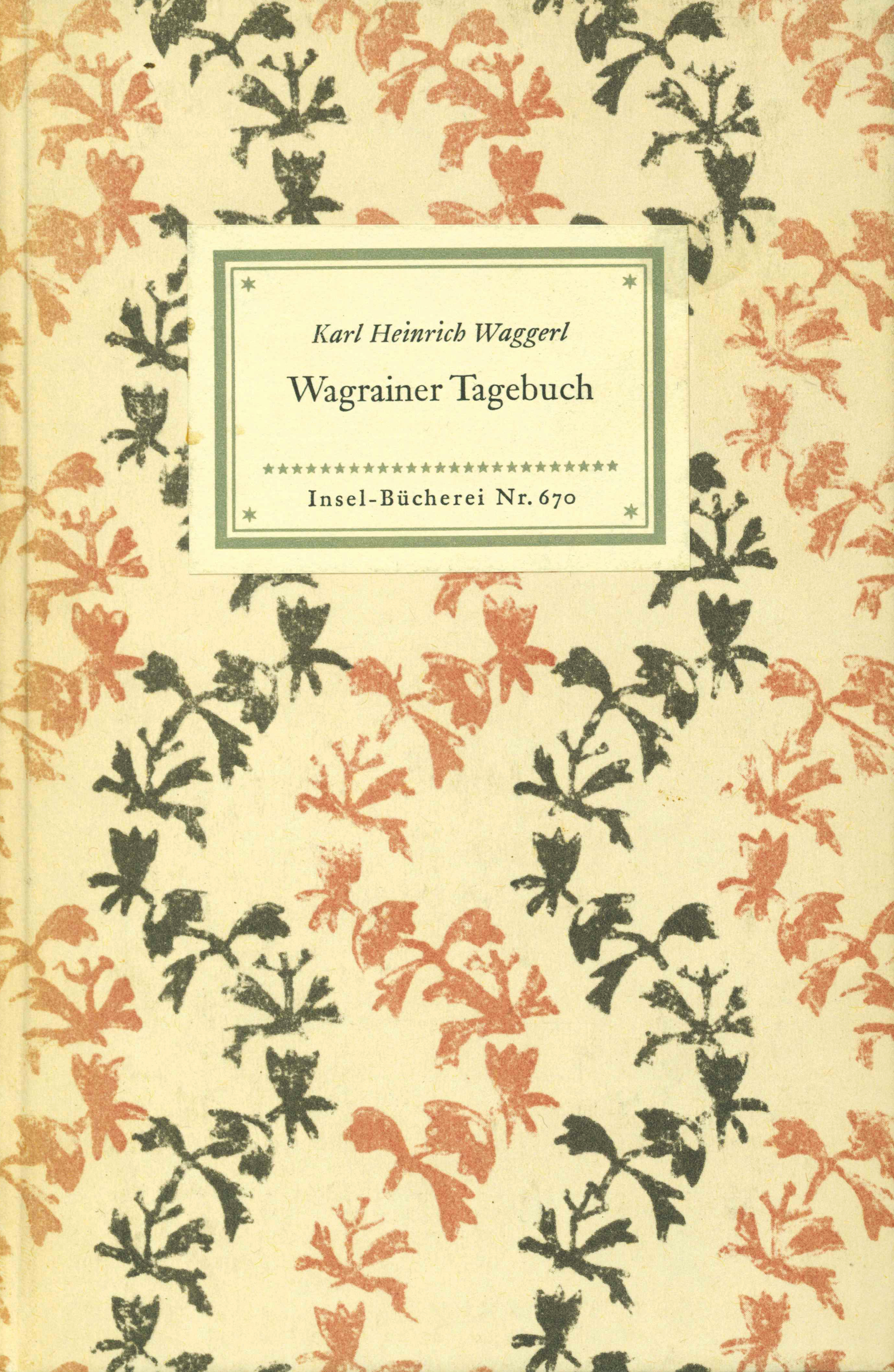 Insel-Bücherei 0670.1 – Waggerl, Karl Heinrich, Wagrainer Tagebuch. (= Insel-Bücherei 670). Wiesbaden, Insel 1960. 125.-141. Tsd. Kl.-8°. 83 S., OPp. (Überzugspapier Jenne 69). Rücken gering verblasst, sonst sehr gut erhalten. Vgl. Kästner 670.1. * Vortitellblatt von Waggerl eigenhändig signiert. – Seltene Einbandvariante!