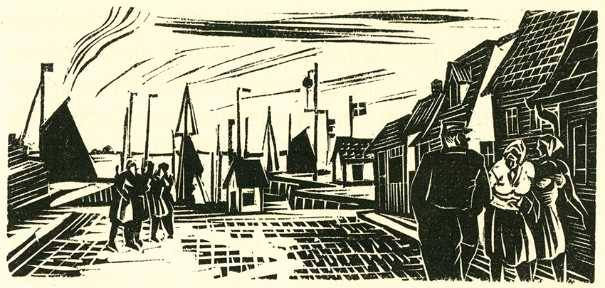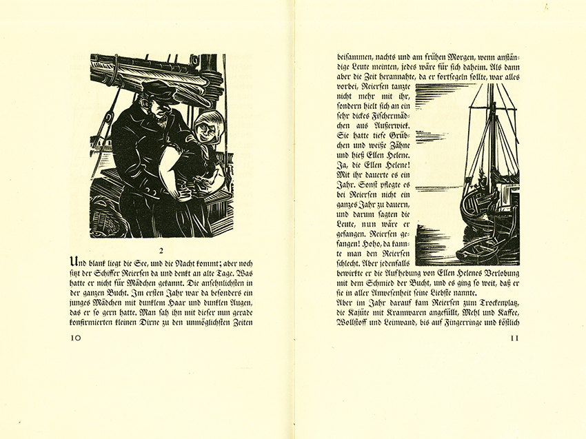 | Müller, H.A. – Hamsun, Knut, Schiffer Reiersen vom Südstern. Mit 17 Orig.-Holzschnitten von Hans Alexander Müller. Leipzig, (Privatdruck) 1934. 4°. 30, (2) S., OInterimspappbd. mit einem weiteren Orig.-Holzschnitt (stellenw. minim. verblasst, Kapitale geringfügig bestoßen). Die Bindung – wie bei Intereimsbindungen nicht unüblich – an einer Stelle etw. gelockert. Insges. gutes, innen sehr frisches, unbeschnittenes Exemplar. 1. Auflage. Eichhorn/Salter 1.56.1. * Eins von 100 Exemplaren, „Freunden dargebracht von Hans Alexander Müller und Poeschel & Trepte“. Druckvermerk mit dreizeil. eigenhänd. Bleistiftwidmung „Hans Alexander Müller / seiner lieben Susi / Weihnachten 1934.“ – Schöner Druck, aus der Lutherschen Fraktur gesetzt u. auf Tosha-Zandersbütten gedruckt.