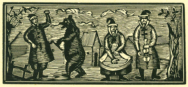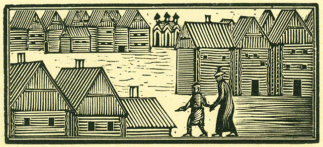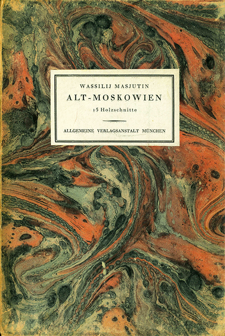 | Masjutin, Wassilij, Alt-Moskowien. 9 (statt 15) Orig.-Holzschnitte. München, Allgemeine Verlagsanstalt (1922). Gr.-8°. Größe der Holzschnitte: 9 x 4 cm. Blattgröße: 25 x 16,5 cm. 9 Graphikbl. auf getöntem Papier, OKartonmappe mit handmarmor. Überzugspapier. Die Mappe beschädigt, jedoch noch wohlerhalten. Die Graphikbl. im linken Randbereich leicht feuchtigkeitsfleckig, die Darstellungen sind davon nicht betroffen, so dass die Holzschnitte unter Passepartouts einen tadellosen Eindruck erwecken würden. Selten. Oestmann 29. * Eins von 150 nummer. Exemplaren. – Masjutin (geb. 1884 in Riga, gest. 1955 in Berlin) wurde vor allem durch seine Illustrationen russischer Literatur bekannt. Obwohl nicht vollständig, liegt hier eine beeinddruckende Folge expressiver Miniaturen aus dem Kerngebiet Altrusslands vor.