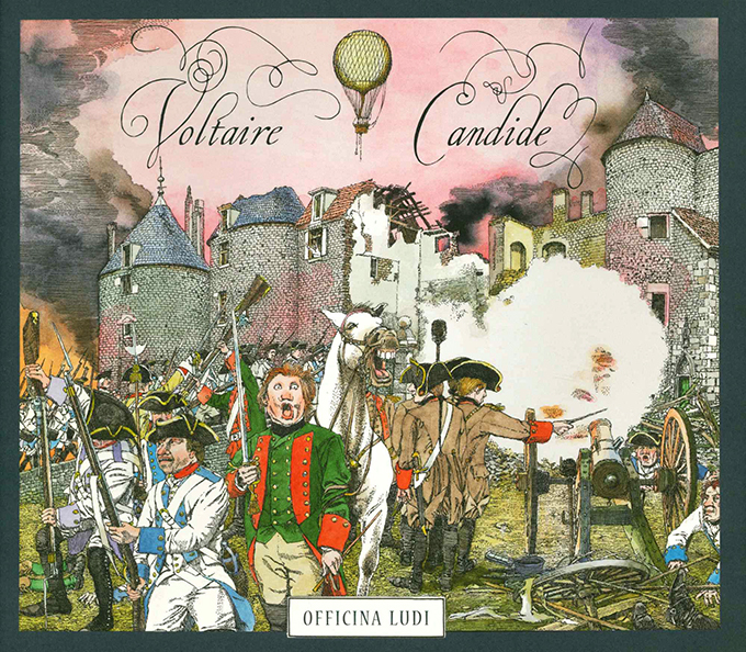 | Ensikat – Voltaire, Candide oder der Optimismus. Neu übersetzt von Tobias Roth u. illustriert von Klaus Ensikat. Großhansdorf, Officina Ludi 2018. 26 x 22,5 cm (quer). 127 S. mit 55 (teils ganzseit.) farb. Illustrationen sowie 30 von Ensikat kalligraphisch geschriebenen Kapitelüberschriften, OPp. mit farb. ill. OUmschl. Verlagsfrisches Exemplar, noch im Orig.-Verlagspapier (nur kurz geöffnet für diese Titelbeschreibung). 1. Auflage. * Eins von 150 (ges. 2000) handschriftl. nummer. Exemplaren der Vorzugsausgabe B mit einer beigelegten, vom Künstler eigenhändig aquarellierten Strichätzung (Porträt Voltaires, der sich beim Flötenspiel Friedrichs des Großen die Ohren zuhält). Auf Zerkall-Bütten gedruckt, nummeriert u. von Ensikat signiert. Das letzte Blatt des Buches ebenfalls nummeriert u. signiert. Außerdem wird die Vorzugsausgabe – im Gegensatz zu den Normalausgaben – in einem illustr. Schmuckschuber bewahrt, der die Zeichnung der Vorsätze aufgreift.