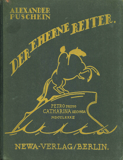 | Masjutin – Puschkin, Alexander, Der eherne Reiter. Ein episches Gedicht. Übertr. von Wolfgang E. Groeger. Vorwort von Arthur Luther. Illustriert von W. N. Masjutin. Berlin, Newa 1922. 24,5 x 32 cm. 42, (2) S. mit 8 (davon 1 zweifarb.) Illustrationen, OHlwd. mit goldgepr. Deckelillustration. Ohne das flieg. Vorsatzblatt, sonst nur minim. Gbrsp.Insges. gut erhalten. Auf fein geripptem Maschinenbütten. Erste u. einzige Auflage, ein Jahr vor der russischen erschienen. Oestmann 12.