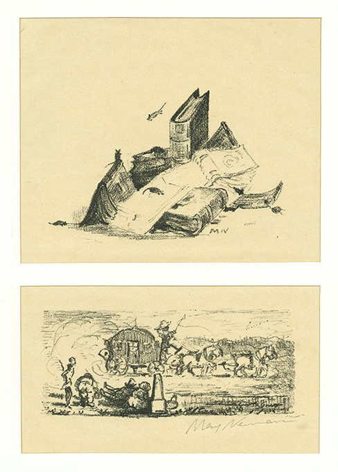 | Neumann, Max, Fürst Ganzgott und Sänger Halbgott. Suitenmappe zur (hier nicht vorliegenden) Vorzugsausgabe des Werks von Achim von Arnim. München, Piper 1919. 27 x 39 cm. 30 Bl. in OHalbleinenmappe (nur diese stärker beschädigt). Titellithographie u. das erste Passepartout mit jeweils 2 oder 3 kl. Stockfleckchen, die Darstellungen nicht betroffen, ansonsten tadellos erhalten und absolut frisch. Rodenberg 365. Schauer II.88. * Eins von 50 Exemplaren. Die Lithographien wurden teils in Rötel- u. Brauntönen auf Japanpapier abgezogen (Titellithographie, 20 ganzseit. Lithographien, 2 Varianten, 7 Bl. mit 25 Randleisten u. kleineren Lithographien). Alle Lithographien signiert, die Blätter mit mehreren kleineren Graphiken jeweils einmal. Alle Blätter außer der Titellithographie in Passepartoutmappen aus weißem Karton.