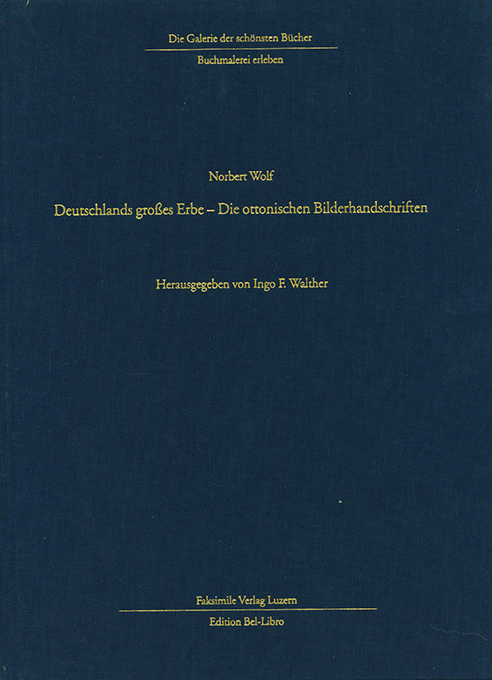 Faksimiles – Wolf, Norbert, Deutschlands großes Erbe – Die ottonischen Bilderhandschriften. Hrsg. von Ingo F. Walther. (= Die Galerie der schönsten Bücher – Buchmalerei erleben). Luzern, Faksimile-Verlag / Edition Bel-Libro (Cop. 2007). 2. Aufl. 23,5 x 32 cm., 125, (3) S. mit sehr zahlr. farb. Abbildungen, OLwd. mit Goldpr. Sehr gutes Exemplar. EA. * Enthält ein Original-Faksimileblatt aus der Bamberger Apokalypse, Folio 46. Beidseitig farbig gedruckt mit Sonderfarbe Gold. Unter einem dicken Papp-Passepartout.