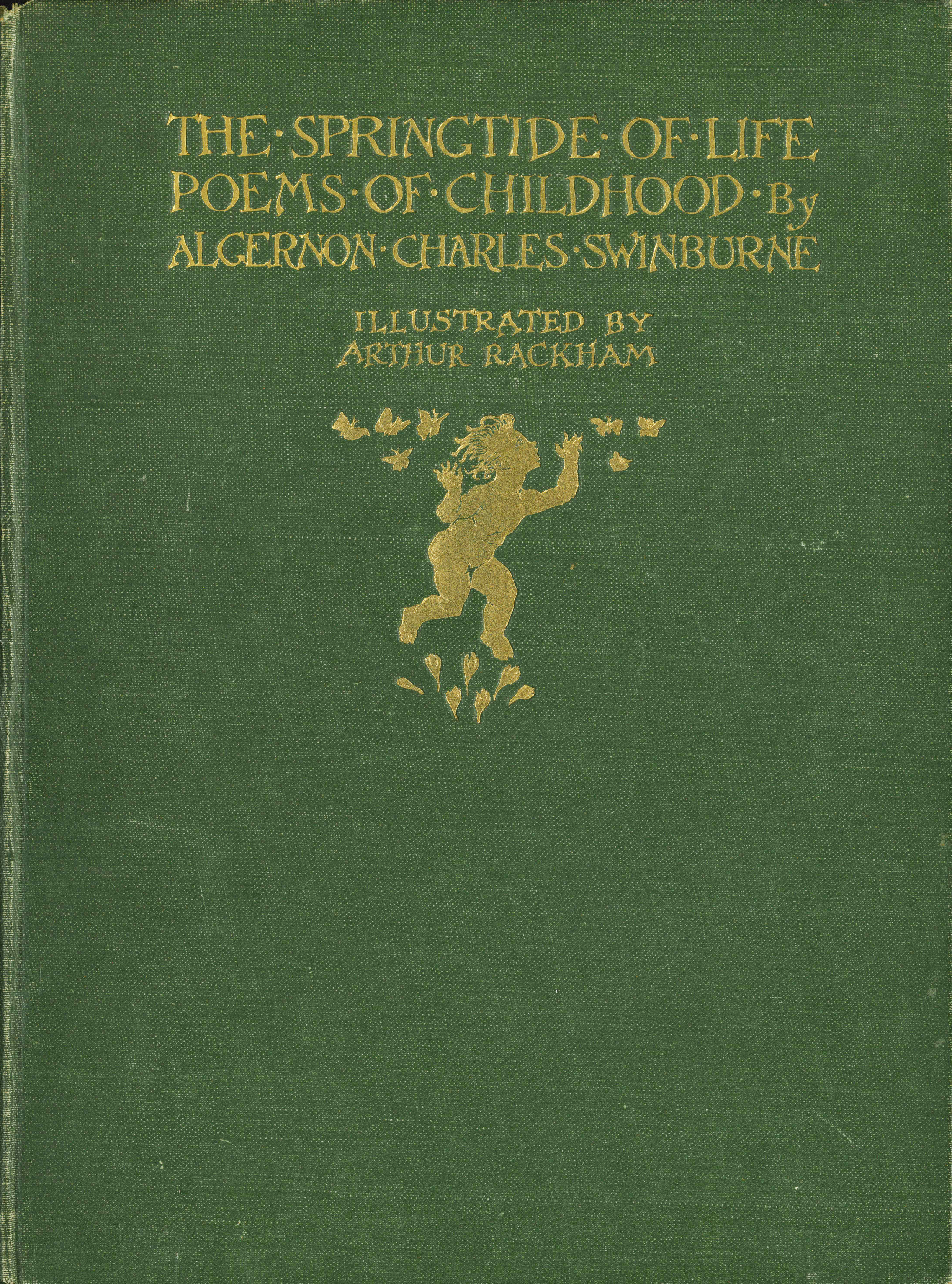 | Rackham – The Springtide of Life. Poems of Childhood by Algernon, Charles, Swinburne. With a Preface by Edmund Gosse. Illustrated by Arthur Rackham. London, Heinemann 1918. 19 x 25,5 cm. 132, (2) S. mit zahlr. Zeichnungen u. Vignetten + 7 Farbtafeln, vorgeschaltet jeweils ein Zwischenblatt mit Bildtitel, illustr. OLwd. mit Goldpr. (etw. berieben u. bestoßen, Kopfkapital mit kl. Läsuren). Vorsatz mit Exlibris u. Namenszug von alter Hand. Insges. ziemlich gutes Exemplar. EA.