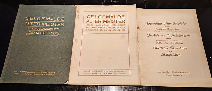 Auktionskataloge – Ölgemälde alter Meister. 3 Auktionskataloge. Nachlässe von Antoine Pesne, Hofschauspieler Anschütz, aus Münchner, Hamburger u. ausländischem Adelsbesitz. München, Helbing 1911 (2 Katage) u. Wien, Schidlof 1922. 4° bzw. Gr.-4°. Zus. 140 Textseiten + 55 Tafeln (überwieg. Lichtdrucke), OBroschuren (teils nachgedunkelt u. fleckig, kl. Läsuren). Papier in einem Band fleckig, teilweise Bleistifteintragungen der Auktionsergebnisse. Insges. wohlerhalten. * Verzeichnet zus. 815 Positionen.