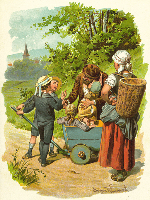 Löhr, J(ohannes) A(ndreas) C(hristian), Erzählungen für kleine Kinder. In neuer Auswahl hrsg. von Cornelie Lechler. Mit 6 feinen Farbdruckbildern von E. Klimsch, sowie 30 Textillustrationen von E. Klimsch, O. Pletsch, F. Flinzer u.a. Zweite durchgesehene Auflage. Stuttgart, Effenberger (1891). 4°. IV, 99 S. + 6 Chromilithotafeln, OHlwd. mit farbiger chromolithograph. Deckelillustration u. goldgepr. Rücken (Kanten berieben, Rücken mit 1 kl. Läsur, der unbedruckte Rückdeckel fleckig). Innendeckel mit altem engl. Besitzvermerk von Kinderhand (″This book is a German book“), Flieg. Vorsatz verso mit einem Besitzvermerk aus dem Jahr 1897. Insges. gutes, innen sehr gutes Exemplar.