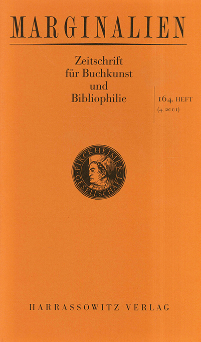 Marginalien, Heft 4 / 2001 (Nr. 164, Vorzugsausgabe). Zeitschrift für Buchkunst und Bibliophilie. Hrsg. von der Pirckheimer-Gesellschaft. Wiesbaden, Harrassowitz 2001. Gr.-8°. 102, (2) S. mit Abbildungen + 8 S. typograph. Beilage (Buchdruck auf getöntem Papier), OBrosch. mit OUmschl. Tadellos. * Mit einer beilieg. Original-Radierung von Hanns Georgi zu Joseph von Eichendorffs „Aus dem Leben eines Taugenichts“. Auf Bütten gedruckt. Aus dem Nachlass des Künstlers, deshalb nicht signiert. – Aus dem Inhalt: Lothar Lang, Wolfgang Würfel und der Holzstich; Die Märchenillustrationen Hanns Georgis. Typograph. Beilage: Bibliophil geschüttelt. Schüttelreime zu Büchern, Lesern, Literaten und Verwandtem.