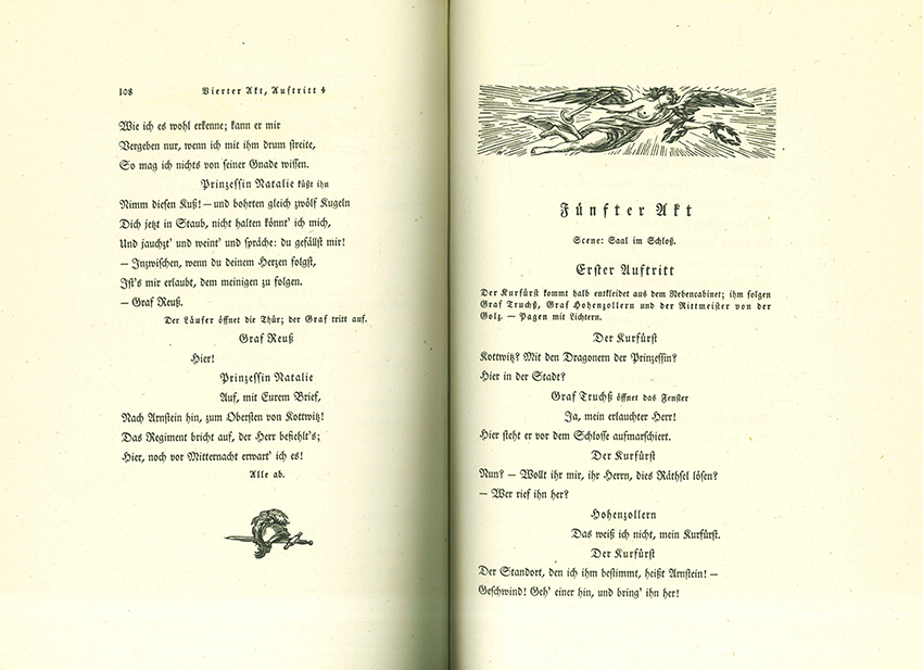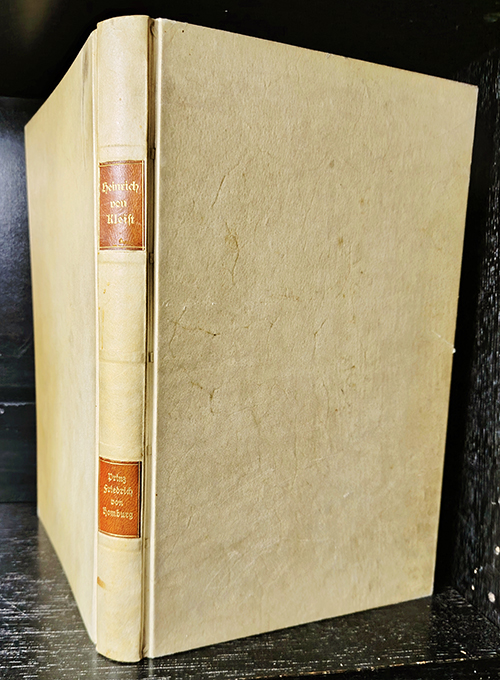 Kleist, Heinrich von, Prinz Friedrich von Homburg. Ein Schauspiel. Nachwort von Fritz Homeyer. Mit Holzschnitten u. Holzschnittvignetten von Ernst Böhm, Renée Sintenis u. Wilhelm Wagner nach Zeichnungen (teils nach alten Vorlagen) von E.R. Weiß. Berlin, Maximilian-Gesellschaft 1913. 20,5 x 33 cm. 1 Bl., (8), 145, (3) S., 1 Bl., Ganzpergamentbd. der Zeit (Rücken mit einigen kl. Fleckchen, kl. Verfärbung im Pergament auf dem Rückdeckel). Insges. sehr gutes Exemplar. Schauer II.39 (mit Abbildung). * Eins von 300 Exemplaren für die Mitglieder der Maximilian-Gesellschaft. Aus der Leibniz-Fraktur gesetzt u. auf handgeschöpftes van Gelder-Bütten gedruckt. Dieses Exemplar in einem schönen Ganzpergamentbd. mit 7 durchgezog. Pergamentbünden, 2 goldgepr. Lederrückenschildern, Kopfgoldschnitt, handgestochenen Kapitalen u. handmarmor. Vorsätzen (signiert: Heyne-Ballmüller, Berlin)