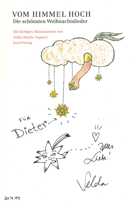 Insel-Bücherei 2002 – Vom Himmel hoch. Die schönsten Weihnachtslieder. Mit farbigen Illustratonen von Selda Marlin Soganci. (= Insel-Bücherei 2002). Berlin, Insel 2012. 13,5 x 22 cm (IB-Großformat). 93, (3) S., farb. illustr. OPp. Die letzten Bl. mit minim. Knitterspuren, sonst sehr gutes Exemplar. EA. * Titelblatt mit eigenhänd. Widmung u. kleiner Zeichnung der Illustratorin. – Beiliegt das Verlagszettelchen zu diesem Band.