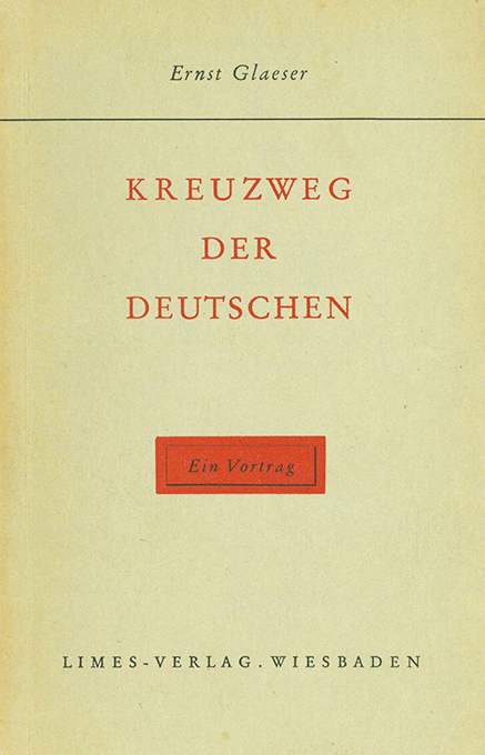 Glaeser, Ernst, Kreuzweg der Deutschen. Ein Vortrag. Wiesbaden, Limes 1947. l8 30, (2) S., OBrosch. Das Nachkriegspapier wie immer materialbed. etw. nachgedunkelt. Insges. sehr gutes Exemplar aus dem Nachlass der Limes-Verlegerin Marguerite Schlüter. EA WG² 17. * Titelblatt mit dreizeil. eigenhänd. Grußwidmung „Einen Gruss von / Ernst Glaeser / 4. August 1947“.