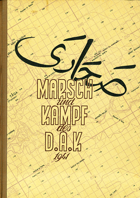 Afrikakorps – Generalkommando des deutschen Afrikakorps (Hg.), Marsch und Kampf des deutschen Afrikakorps. Vorwort in Wiedergabe seiner Handschrift von Generalfeldmarschall Erwin Rommel. Band 1: 1941. München, Röhrig 1943. 21 x 30 cm. 215 S. mit zahlr. Zeichnungen „unter dem unmittelbaren Eindruck des Kampfgeschehens an der Front“ von Kurt Caesar, illustr. OHlwd. (dieser mit nur minim. Gbrsp.) Vorsatz mit 2 Stempeln, Papier wie immer materialbed. etw. nachgedunkelt. Insgesamt gutes Exemplar. EA. Die Originalausgabe, nicht zu verwechseln mit dem Nachdruck 1994.