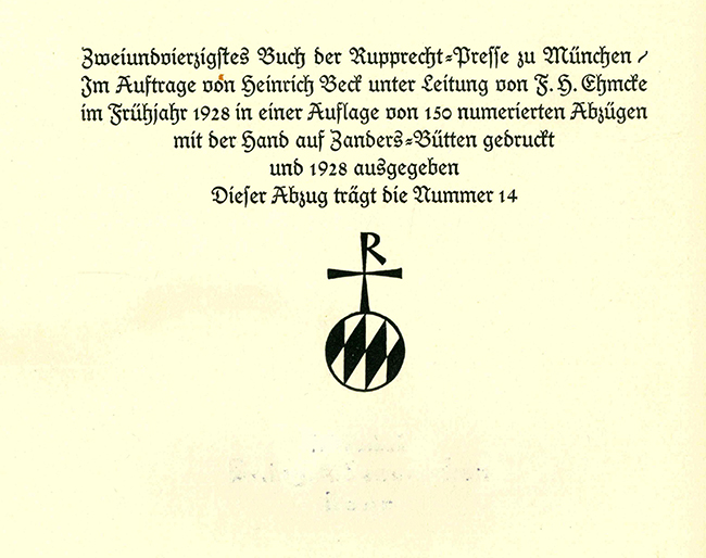 Rupprecht-Presse – Tieck, Ludwig, Der gestiefelte Kater. Ein Kindermärchen in drei Akten mit Zwischenspielen / einem Prologe und Epiloge. München 1928. 4°. 3 Bl., 88, (2) S., 2 Bl., Ganzlederbd. (der sehr farbempfindliche Rücken verblasst). Titelbl. u. Colophon mit jeweils einem nahezu gelöschten Besitzstempel, Vorsätze ebenfalls jeweils mit Stempel, dort allerdings kaum auffallend, da über den farbig gemusterten Vorsatzpapieren. Insges. gutes Exemplar im Schuber mit Lederkanten. Rodenberg 536.42. Vgl. Tenschert Kat. XLVI.42b. * 42. Druck der Rupprecht-Presse. Eins von 150 in der Presse nummer. Exemplaren. Das Märchen wurde aus der Ehmcke-Brotschrift und unter Leitung von F.H. Ehmcke gesetzt u. auf der Handpresse auf Zanders-Bütten gedruckt. – Dieses Exemplar in einem türkisblauen Maroquin-Ganzfranzband mit goldgepr. Deckelvignette, goldgepr. Rücken, Außen- u. Innenkanten, handgestochenen Kapitalen u. Kopfgoldschnitt. Für die Vorsätze kam das gleiche farbige Original-Kleisterpapier zum Einsatz, welches für die gewöhnlichen Pappbände verwendet wurde.