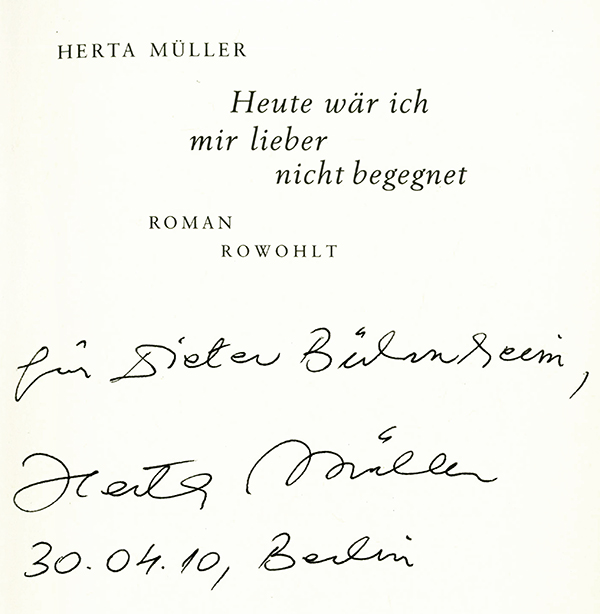 Müller, Herta, Heute wär ich mir lieber nicht begegnet. Roman. Reinbek, Rowohlt 1997. 239 S., OLwd. mit sehr zart blindgepr. Illustration bzw. Vignette auf Vorder- u. Rückdeckel sowie farb. illustr. OUmschl. Gutes Exemplar. EA. * Titelblatt mit dreizeil. eigenhänd. Widmung der Literatur-Nobelpreisträgerin.