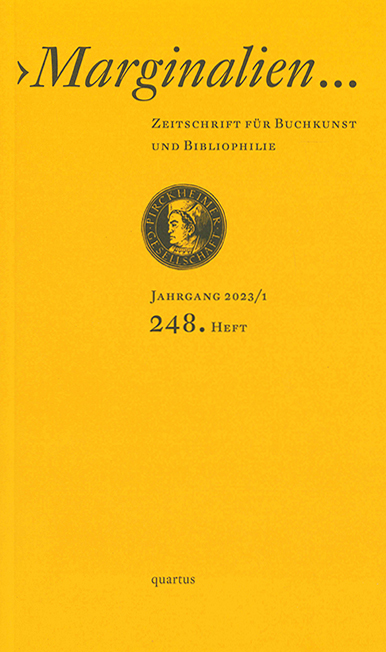 Marginalien, Heft 1 / 2023 (Nr. 248, Vorzugsausgabe). Zeitschrift für Buchkunst und Bibliophilie. Hrsg. von der Pirckheimer-Gesellschaft. Bucha, quartus 2023. Gr.-8°. 128 S. mit zahlr. Abbildungen, 8 S. typograph. Beilage (Buchdruck auf Maschinenbütten), OKlappenkart. Tadellos. * Mit einer beilieg. Orig.-Radierung (Kupferstich u. Aquatinta) von Wolfgang Böttcher „Fonte Arethusa“, nummeriert (eins von 150 Ex.) u. monogrammiert. – Aus dem Inhalt: Wolfgang Böttcher zum 75. Geburtstag; Esteban Fekete; Literaturzeitschrift „Palmbaum“; Eckehart Schumacher-Gebler (3 Beitr. zu seinem Tod); Das Christian Schad Museum. – Typograph. Beilage: Klaus Modick, Casco in Kanda. Gestaltet u. kommentiert von Matthias Gubig.