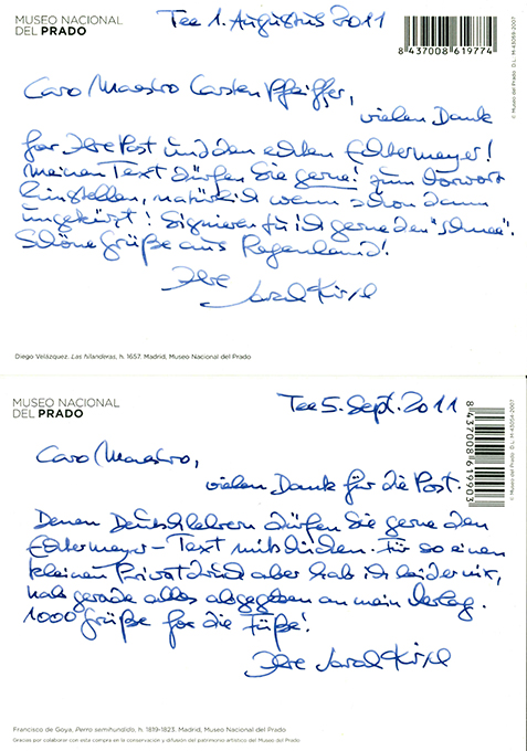 Kirsch, Sarah, Zwei eigenhänd. Postkarten mit Unterschriften. Eiderdeich, 1. Aug. u. 5. Sept. 2011. Bildseiten mit Gemälden spanischer Meister. Mit einem eigenhänd. Briefkuvert. * Antwortet auf einen (in Kopie beiliegenden) Brief eines Verlagsmitarbeiters, in dem sie gefragt wird, ob einer ihrer Texte in Theodor Echtermeyers „Deutsche Gedichte“ dem Vorwort einer Neuauflage vorangestellt werden darf. Dies bejaht sie, dankt für ein Belegexemplar, lehnt einen Privatdruck mit ihren Gedichten ab.