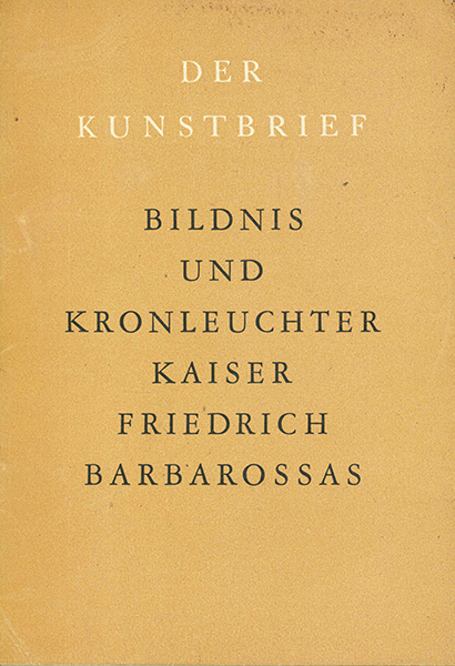 Barbarossas Schätze – Meyer, Erich (Einf.), Bildnis und Kronleuchter Kaiser Friedrich Barbarossas. (= Der Kunstbrief 27). Berlin, Gebr. Mann 1946. Kl.-8°. 32 S. mit 5 Abbildungen + 16 Tafeln, OBrosch. (die letzten 13 Bl. mit kl. Eckfehlstellen (5 x 8 mm). Sonst gutes Exemplar. EA.