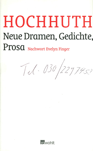 Hochhuth, Rolf, Neue Dramen, Gedichte, Prosa. Nachwort von Evelyn Finger. Hrsg. von Hans Georg Heepe. Reinbek, Rowohlt 2006. 1274, (6) S. mit Titelportrait, OPp. mit OUmschl. Sehr gut erhaltene Dünndruckausgabe. EA. * Titelblatt mit einer vierzeil. eigenhänd. Widmung des legendären Dramatikers an den Leipziger Antiquar Dieter Bührnheim, außerdem hat Hochhuth auf den Umschlag seine Telefonnummer geschrieben – kein Respekt vor Schutzumschlägen, der Herr!