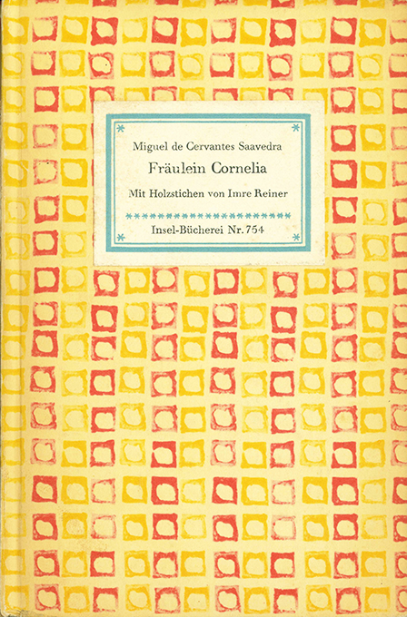 Reiner – Cervantes Saavedra, Miguel de, Fräulein Cornelia. Mit sieben Holzstichen von Imre Reiner. (= Insel-Bücherei 754). Leipzig, Insel 1962. Kl.-8°. 64, (4) S., zweifarb. gemusterter OPp. (Jenne 298; Rücken u. Vorsätze etw. nachgedunkelt). Insgesamt gutes Exemplar. 1. Auflage. Tiessen 22. Kästner 754.