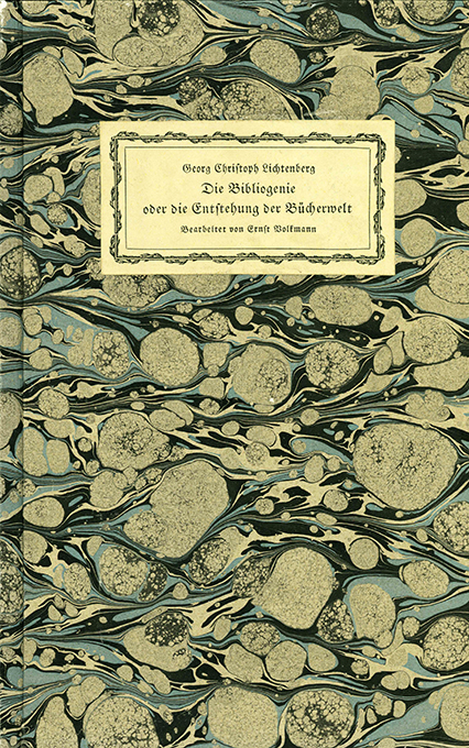 Lichtenberg, Georg Christoph, Die Bibliogenie oder die Entstehung der Bücherwelt. Eingeleitet und bearbeitet von Ernst Volkmann. Weimar 1942. 107, (3) S. mit Titelportrait, OPp. mit handmarmor. Überzugspapier (Rückenschild berieben). Sonst sehr gutes Exemplar. 1. Auflage. * In 1200 Exemplaren für die Gesellschaft der Bibliophilen auf weißgerippt Lipsia-Büttenpapier gedruckt.