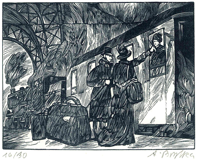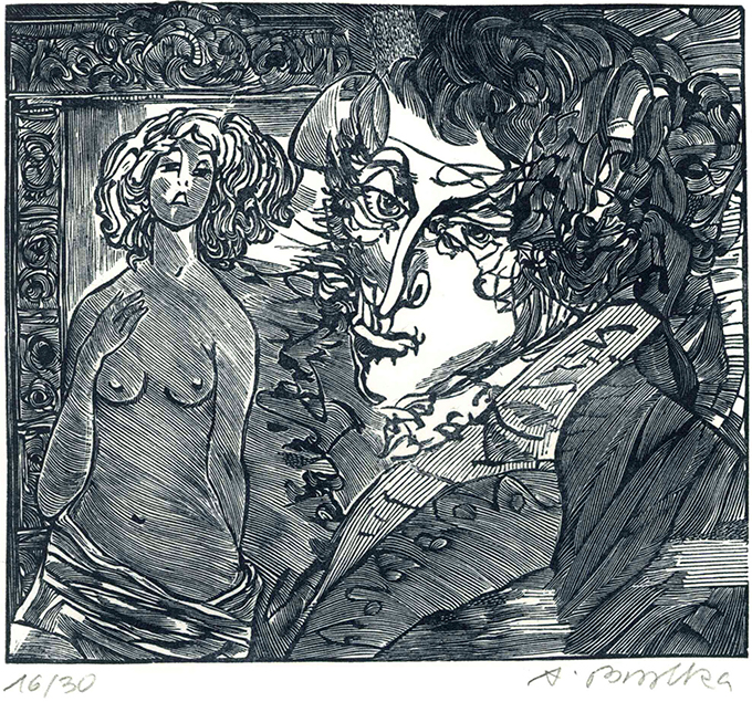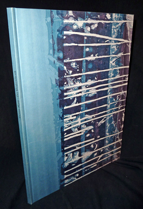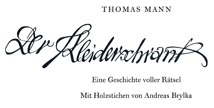 Mann, Thomas, Der Kleiderschrank. Eine Geschichte voller Rätsel. Mit zwei Orig.-Holzstichen, gestochener Titelzeile u. Initiale von Andreas Brylka, gedruckt in Nachtblau. Garching 1991. Gr.-4°. 17, (3) S., OPp. mit handoleographiertem Überzugspapier (Roland Meuter). Tadelloses Exemplar. 1. Auflage. * Zweiter Druck der Antinous Presse / Zweiter Druck der PROSA-Blätter. – Eins von 90 (ges. 125) nummer. Exemplaren, im Druckvermerk von Brylka signiert. – Handsatz aus der Bell-Antiqua, gedruckt auf Hahnemühle Kupferdruck-Bütten. Der zweite Druck meiner Edition.