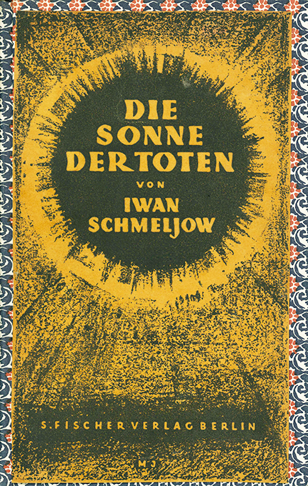 Schmeljow, Iwan, Die Sonne der Toten. Übertr. von Käthe Rosenberg. Berlin, S. Fischer 1925. 318, (2) S., späterer Pappbd. mit zweifarb. gemustertem Überzugspapier u. goldgepr. Lederrückenschild. Tadelloses Exemplar im individuellen Handeinband (statt kartoniert). DEA. * Beiliegt die Vorderseite aus dem Originalkartoneinband, welche – wie auf dem Bild dargestellt – auf den Einband montiert werden kann. Außerdem liegt ein gedr. Brief von Ernst Wiechert an Schmeljow bei (″Aber wer wie Sie das Werk an Stelle des Lebens setzt, wird nie verloren sein. Leben Sie wohl, wie Sie immer in meinem Herzen leben. In dankbarer Verehrung, Ihr treu ergebener Ernst Wiechert“) sowie ein Text (wohl auch von Wiechert) über Schmeljow. Zus. 8 Seiten.