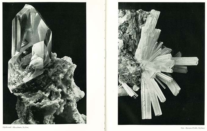 Ehrhardt, Alfred, Kristalle. 64 Aufnahmen. Einführung von Waldemar Schornstein. Hamburg, Ellermann 1939. 4°. 79 S., OLwd. (minim. gewölbt). Gutes Exemplar. EA. Heidtmann 14097. * Ein absoluter Klassiker der Mineralienfotografie. Der Fotograf der Neuen Sachlichkeit fotografierte die Kristalle mit extremem Detailreichtum, Schärfe und Präzision. Die Aufnahmen verwandeln die wissenschaftlichen Objekte in abstrakte, ästhetische Kunstwerke. Ehrhardt betrachtete Kristalle nicht nur als tote Materie, sondern als „lebendige“, organisch wirkende Formen, die die Ordnung der Natur widerspiegeln.