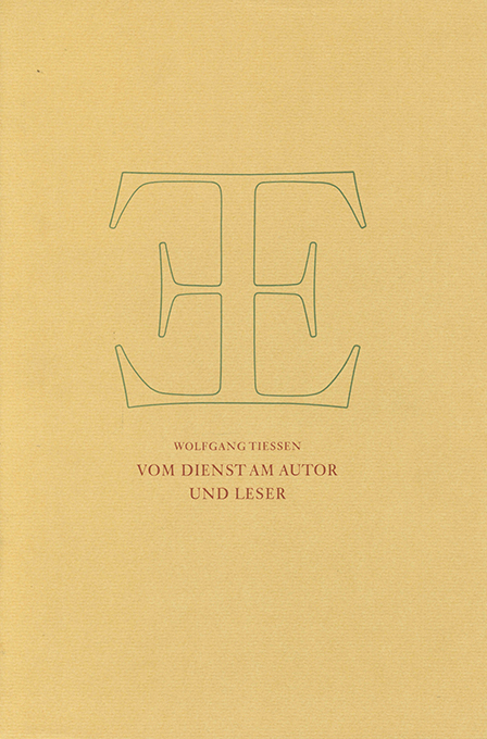 Tiessen, Edition – Tiessen, Wolfgang, Vom Dienst am Autor und Leser. Über die Gestaltung meiner Bücher. Neu-Isenburg 1987. 20,5 x 30 cm. 11, (5) S., OBüttenumschl. Gutes Exemplar. EA. * 21. Sonderdruck der Edition Tiessen. Eins von 500 Exemplaren, von Hand gesetzt u. auf Vélin d’Arches gedruckt. Im Druckvermerk von Tiessen signiert.