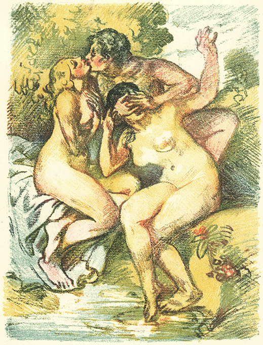 Hasler – Bethge, Hans, Die indische Harfe. Mit zweifarb. lithograph. Titelvignette u. 10 (davon 4 farb.) ganzseit. Orig.-Lithographien von Bernhard Hasler. Berlin, Morawe & Scheffelt 1913. Gr.-4°. 108, (6) S. + 10 Graphikbl., gemusterter Orig.-Seidenbd. mit Kopfgoldschnitt (der unbeschnittene Schnitt u. 4 Bl. kaum auffallend etwas stockfl.) Insgesamt, vor allem in Anbetracht der großen Empfindlichkeit des Seidenüberzugs, sehr schönes Exemplar im Schuber. EA. * Eins von 250 nummerierten Exemplaren, auf Van Gelder-Bütten mit Wasserzeichen gedruckt.