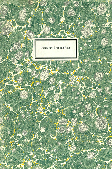 Tiessen, Edition – Hölderlin, Brot und Wein. Mit einer Orig.-Farbradierung von Friedrich Meckseper. Neu-Isenburg 1980. 20,5 x 30 cm. (6), 9 S., handmarmor. OKt. (Kanten stellenw. kaum sichtbar berieben). Sonst tadellos. Spindler 41.14. * 14. Druck der Edition Tiessen. Eins von 250 numer. Exemplaren. Die Radierung vom Künstler signiert. – Aus der Janson Antiqua von Hand gesetzt und auf Vélin d’Arches gedruckt.