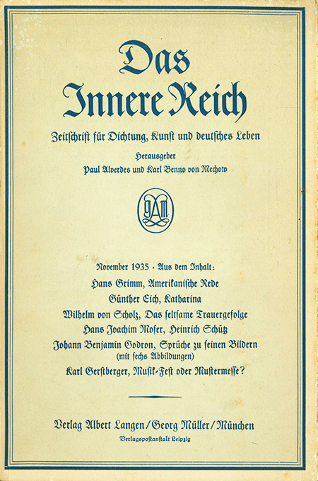 Eich, Günter, Katharina. Eine Erzählung. Erstdruck in: Das Innere Reich 8 (November)1935. Gr.-8°. S. 934 – 980. OBrosch. (etw. unfrisch, Umschlagrückseite mit Fehlstelle). Sonst gutes Exemplar mit dem langen Vorabdruck von Eichs dritter Buchveröffentlichung.