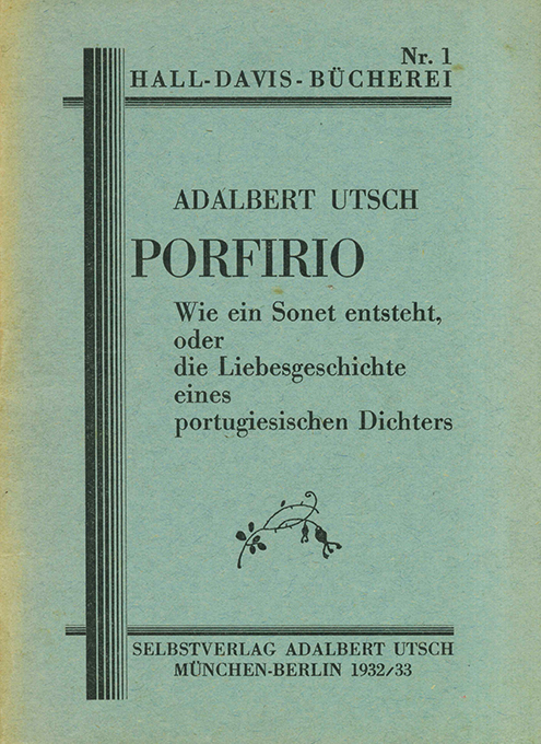 Utsch, Adalbert, Porfirio. Wie ein Sonet [sic] entsteht oder die Liebesgeschichte eines portugiesischen Dichters. (= Hall-Davis Bücherei Nr. 1). München-Berlin, Selbstverlag des Verf. 1932/33. Kl.-8°. 14, (2) S., OKt. (dieser am Rücken verblasst). Sonst gutes Exemplar. Selten. EA. * Vom Verfasser signiert.
