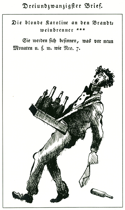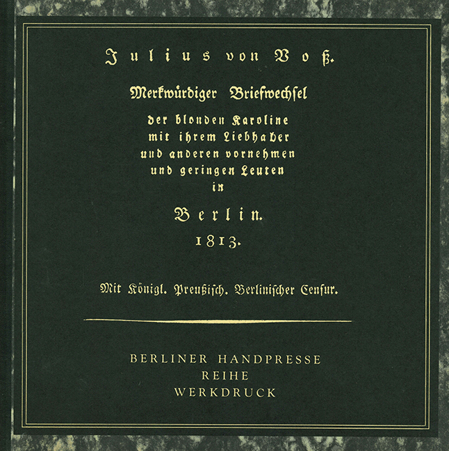 Berliner Handpresse – Voß, Julius, Merkwürdiger Briefwechsel der blonden Karoline mit ihrem Liebhaber und anderen vornehmen und geringen Leuten in Berlin 1813. Hrsg. mit kritischen Anmerkungen von Uwe Otto. Mit Illustrationen von Wolfgnag Jörg u. Erich Schönig. Berlin, Berliner Handpresse 1978. 27 x 27,5 cm. 41 S., OHlwd. (Blockbuchbindung). Gutes Exemplar. * Reihe Werkdruck No. 7. Eins von 1200 nummer. Exemplaren, im Druckvermerk von beiden Künstlern signiert.