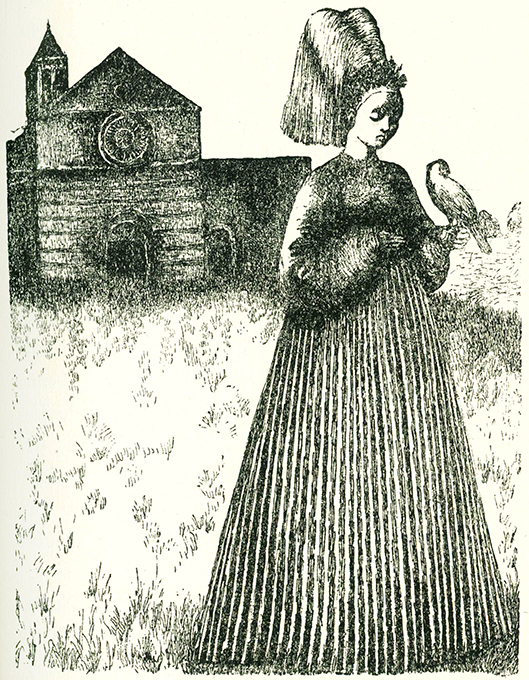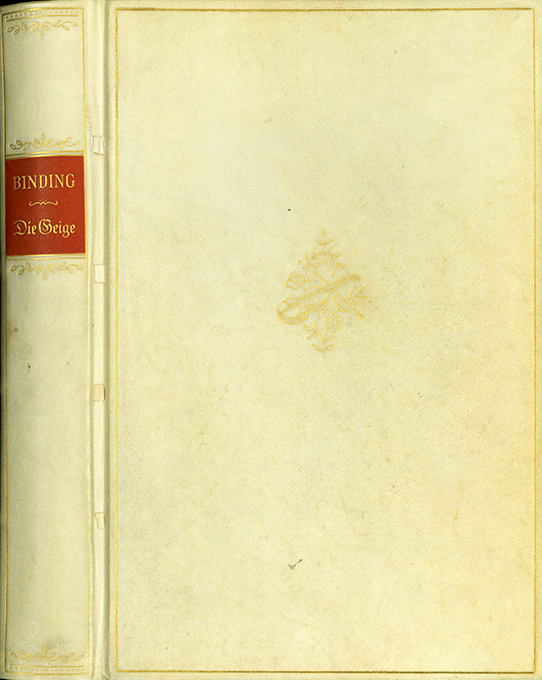 Nagel – Binding, Rudolf G., Die Geige. Vier Novellen. Mit 54 Zeichn. von Hanna Nagel. Berlin 1925. 274, (4) S., OPgmt. mit vier durchgezog. Pergamentbünden, Goldpr. u. Ganzfarbschnitt. Sehr gutes Exemplar. * V. Band der „Liebhaberdrucke der Deutschen Buch-Gemeinschaft“. Eins von 500 handschr. nummer. Exemplaren der Vorzugsausgabe, im Druckvermerk von der Künstlerin signiert. – Inhalt: Die Waffenbrüder; Angelucia; Der Opfergang; Die Vogelscheuche.