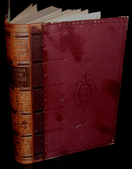 Volkslied – Liliencron, Rochus Freiherr von (Hg.), Deutsches Leben im Volkslied um 1530. (= Deutsche National-Litteratur, hrsg. von Joseph Kürschner, 13. Band). Berlin u. Stuttgart, Spemann 1884. LXX, (2) S. Einführung u. Erläuterungen zu den Liedern, 436, (2) S., teilweise zweifarbig gedruckt, OHalblederbd. mit reicher Rückenvergoldung (Rücken verblaßt, etw. berieben u. fingerfleckig). Insges. nur geringe Gbrsp., gutes Exemplar. EA.