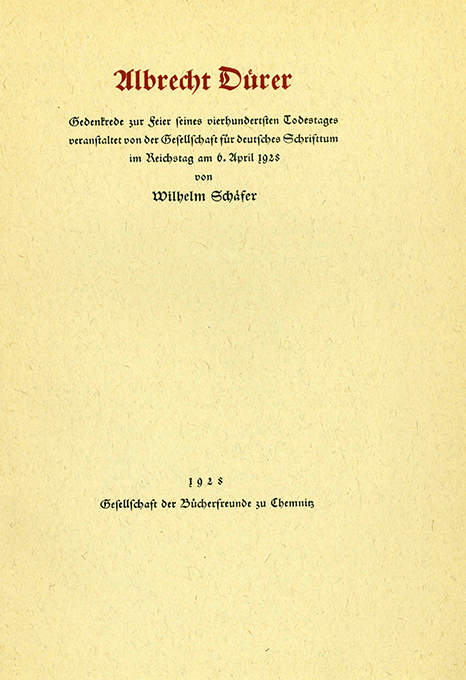 Dürer – Schäfer, Wilhelm, Albrecht Dürer. Gedenkrede zur Feier seines vierhundertsten Todestages. Chemnitz, Gesellschaft der Bücherfreunde 1928. 4°. 19, (3) S., OBüttenbroschur (stellenw. nachgedunkelt u. mit kl. Randläsuren). Innen absolut tadellos erhalten. EA WG² 87. * Eins von 350 (ges. 850) Exemplaren der nicht nummer. Auflage, welche für die Mitglieder der Gesellschaft der Bibliophilen bestimmt waren. Schöner Druck auf getöntem, altdeutschen Bütten.