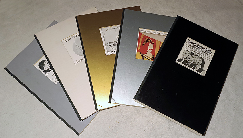 Rixdorfer Drucke – 7 Jahre Rixdorfer Drucke Berlin. Fünf Bände. Hamburg, Merlin 1970. 4°. Zus. 340 S. mit zahlr. (teils farb.) Abbildungen, OPpbde. mit jeweils ausgestanztem Fenster. Die Bände an einer Ecke jeweils etw. angestaucht, Einbände einschl. Fensterausschnitte teils zart fleckig. Sonst gutes Exemplar in (stellenw. etw. beriebenem) Schuber. EA. * Fünf Bände: I. Oeuvre Verzeichnis Werkstatt Rixdorfer Drucke (Bücher, Plakate, Bilderbögen, Kalender, Mappenwerke, Flugblätter). Hrsg. von Heinz Ohff. II. Uwe Bremer. Ölbilder & Radierungen. III. Ali Schindehütte. Frühe Zeichnungen, Tafelbilder, Illustrationen, Holzschnitte, Lithographien, Radierungen. IV. Johannes Vennekamp. Reklame für mich. V. Arno Waldschmidt. Gepräge & Bilder.