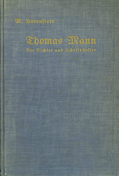 Mann, Th. – Havenstein, Martin, Thomas Mann. Der Dichter und Schriftsteller. Berlin, Wiegandt & Grieben 1927. Gr.-8°. (14), 357 S. mit Titelportrait, OLwd. mit Goldpr. (stellenw. stark verblasst). Schnitt, Vorsätze u. Portrait etw. fleckig, Besitzvermerk. Teilweise Bleistiftanstr.– u. marginalien. Insgesamt noch wohlerhalten. EA. Jonas 27.33