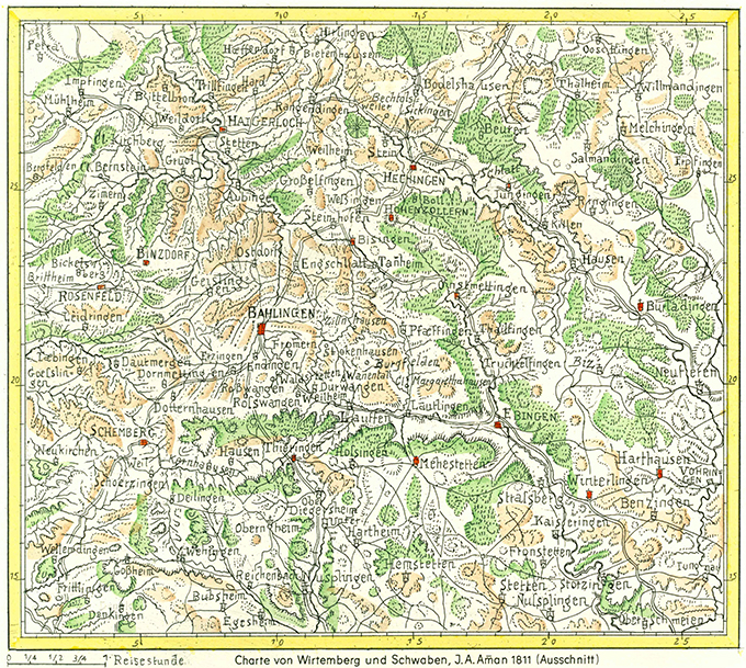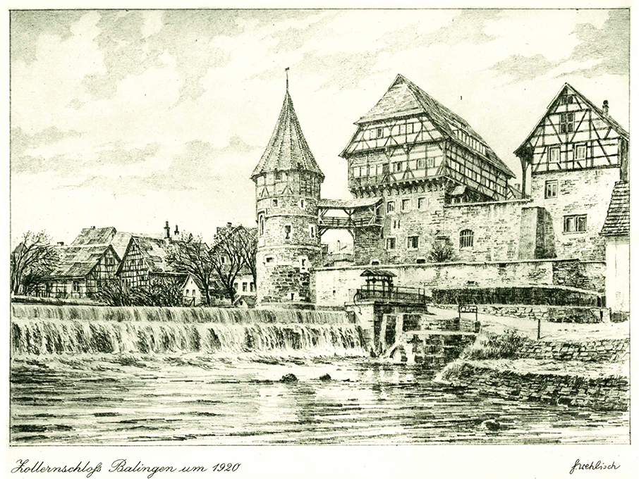 Balingen – Historische Ansichten aus dem Geschäftsgebiet der Kreissparkasse Balingen. Um 1960. 4°. 8 Bl. in goldgepr. OLeinenmappe. * Enthält 7 Orig.-Radierungen von Heinz Wehlisch nach historischen Photographien sowie eine handkolorierte Radierung „Charte von Wirtemberg und Schwaben“ (Ausschnitt) nach einer Vorlage von 1811.