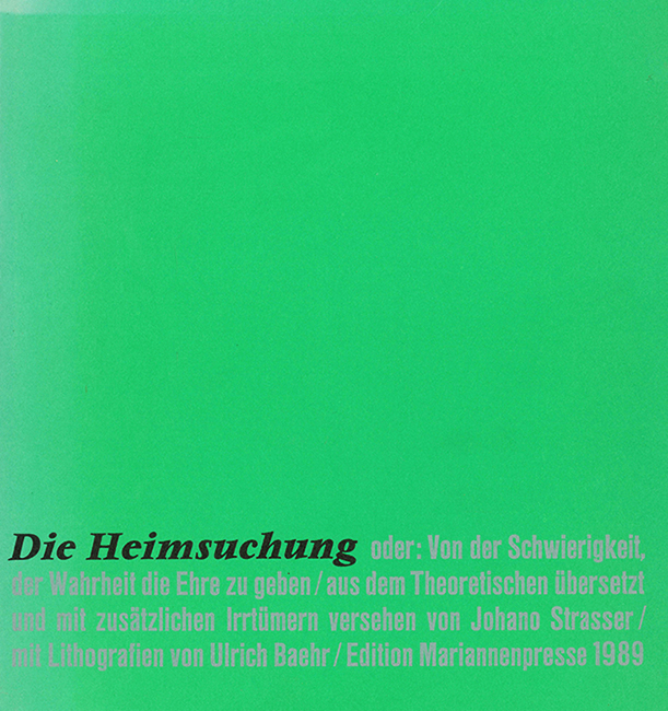 Strasser, Johano, Die Heimsuchung oder: Von der Schwierigkeit, der Wahrheit die Ehre zu geben. Aus dem Theoretischen übersetzt und mit zusätzlichen Irrtümern versehen. Mit 6 doppelblattgr. Orig.-Lithographien von Ulrich Baehr. Berlin 1989. 24 x 25,5 cm. 61, (3) S., OPp. mit OUmschl. (dieser stellenw. verblaßt, Kopfschnitt mit einigen Stockfl.) Sonst tadellos. EA. * 50. Veröffentlichung der Edition Mariannenpresse. – Eins von 200 handschr. nummer. Exemplaren, von Autor u. Künstler signiert. Satz des Textes aus der Helvetica mager.