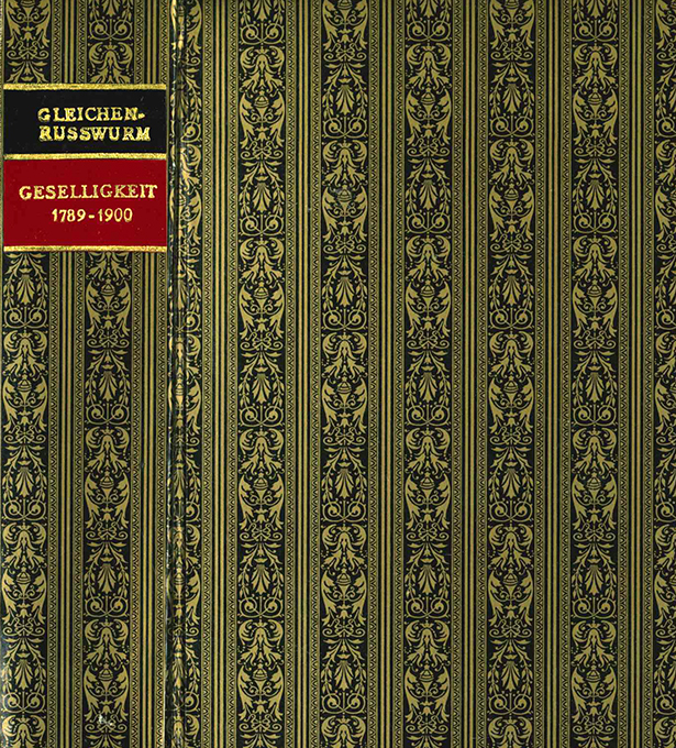Gleichen-Rußwurm, Alexander von, Geselligkeit. Sitten und Gebräuche der europäischen Welt 1789 – 1900. Stuttgart, Hoffmann 1910. VIII, 473 S., neuer Pappbd. mit ornamentalem goldfarbenen Überzugspapier u. zweifarb. goldgepr. Lederrsch. Sehr gutes Exemplar im individuellen Handeinband. EA WG1 20 (Autor nicht mehr bei WG²).