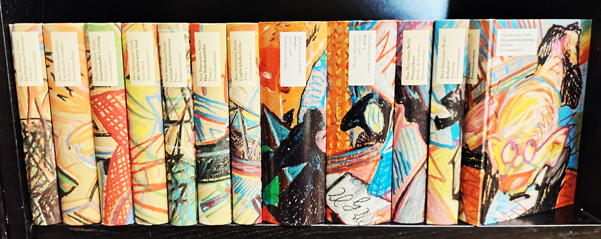 Herrmann-Neiße, Max, Gesammelte Werke in zehn Bänden. DAZU: Briefe in zwei Bänden. Hrsg. mit Anmerkungen von Klaus Völker u. Michael Prinz (Briefe). Zus. 12 Bände. Frankfurt, Zweitausendeins 1986 – 1988 bzw. Berlin, Verbrecher-Verlag 2012 (Briefe). Werkausgabe: zus. 6210 S., Briefe: zus. 2184 S., farbige OPappbände. Die Schnitte der Werkausgabe sehr zart stockfl., sonst tadellos erhalten. Sämtliche Bände liegen in erster Ausgabe vor. WG² 31. Raabe² 118.35. * Die erste u. einzige Werkausgabe umfaßt: Gedichte 1 – 4: Im Stern des Schmerzes. – Um uns die Fremde. – Schattenhafte Lockung. – Mir bleibt mein Lied. – Prosa 1 – 3: Cajetan Schaltermann / Die Bernet-Paule. – Der Todeskandidat. – Unglückliche Liebe. – Panoptikum. Stücke und Schriften zum Theater. – Kabarett. Schriften zum Kabarett und zur bildenden Kunst. – Die neue Entscheidung. Aufsätze und Kritiken zu Literatur und Politik. – Briefe I (1906 – 1928) u. II (1929 – 1940). – Für jeden Einband schuf Johannes Grützke eine andere, expressive, farbige, über beide Buchdeckel u. den Rücken laufende Einbandzeichnung, jeweils mit einem Portrait Herrmann-Neißes. – Beiliegt eine umfangr. Zeitungsrezension der Briefbände u. weiterer Herrmann-Neiße-Neuerscheinungen.