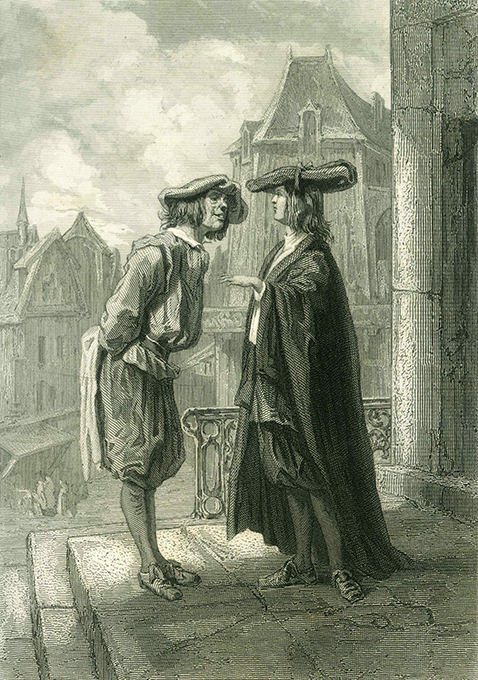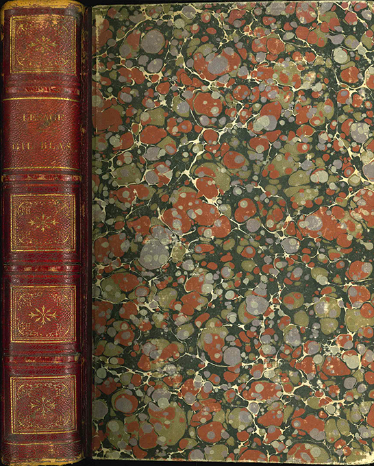 Gavarni – Le Sage, (Alain René), Histoire de Gil Blas de Santillane. Précédée d’une introduction par M. Jules Janin. Illustrations de Gavarni. Paris, Morizot (1863). 4°. VIII, 580 S. + 20 Kupfertafeln, gestochen von Colin, Delannoy, Outhwaite u.a. Halblederband der Zeit mit Rückenverg. u. Ganzgoldschnitt. Kanten u. Gelenke beschabt, einige Lagen geringfügig gelockert. Vortitelbl. mit Läsuren u. lose. Titelblatt an einer Ecke ausgebessert. Papier stockfleckig, wovon die Tafeln im Bild kaum betroffen sind. Rümann, Das illustr. Buch des XIX. Jh., S. 359.