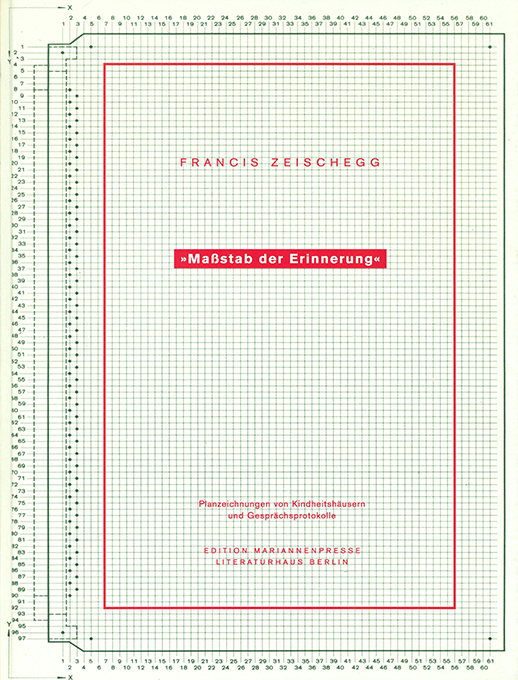 Mariannenpresse – Zeischegg, Francis, „Maßstab der Erinnerung“. Planzeichnungen von Kindheitshäusern und Gesprächsprotokolle. Berlin 2000. Gr.-4°. (48 S.) mit (teils farb.) Photos u. 20 Orig.-Offsetlithographien, illustr. OPp. Sehr gutes Exemplar im Schuber. EA. * 105. Druck der Mariannenpresse. Eins von nur 10 (ges. 100) nummer. Exemplaren einer nicht ausgewiesenen Vorzugsausgabe mit einer beilieg. zweifarbigen Orig.-Lithographie auf Bütten, nummeriert (10 Ex.), datiert u. signiert.