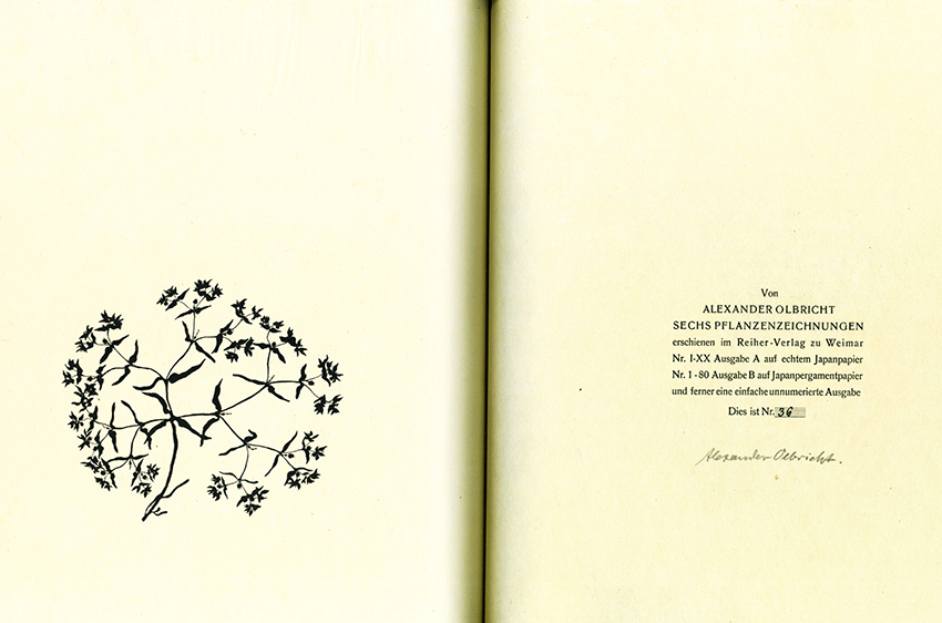 Olbricht, Alexander, Sechs Pflanzenzeichnungen. Lithographien nach Originalen im Städtischen Museum zu Erfurt. Geleitwort von Edwin Redslob. Weimar, Reiher-Verlag 1922. 26,5 x 38,5 cm. (16 S.) mit 4 lithogr. Vignetten u. 6 ganzseit. Orig.-Lithographien, OBrosch. (Blockbuchbindung). Das sehr empfindliche Seidenband, mit welchem das Buch gebunden ist, stellenw. zerschlissen, sonst trotz der hohen Empfindlichkeit hervorragendes, nahezu verlagsfrisches Exemplar. * Eins von 80 nummerierten Exemplaren der Vorzugsausgabe (B) auf Japanpergamentpapier, dieses im Druckvermerk von Olbricht signiert – eigentlich wurden nur die Luxusexemplare signiert. – Edwin Redslob über Olbrichts Arbeiten: „sie sind zart und kostbar, man möchte sich ihrem Genuss still und ohne Worte hingeben“.