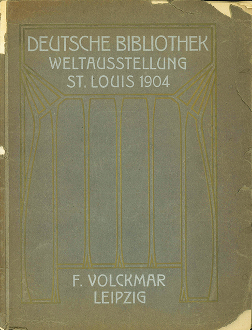 Deutsche Bibliothek. Weltausstellung St. Louis. Worlds Exposition. German Library. 1904. Gr.-8°. 72 S. mit helltürkisen Schmuckrahmen auf allen Seiten, OBrosch. mit Goldpr. (Rücken stark beschädigt, dadurch der Buchblock an zwei Stellen vollständig gebrochen, mehrere Fehlstellen an den Rändern). Titelbl. etw. angeschmutzt, wenige Bleistiftanstr. Innen insges. gut erhalten. Seltene Originalausgabe, nicht zu verwechseln mit späteren Reprints. * Auflistung sämtlicher ausgestellter Bücher nebst Verkaufspreisen. Auf Bütten gedruckt.