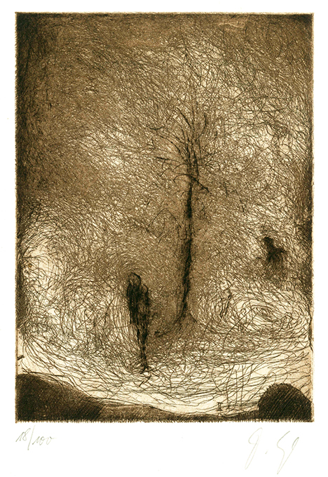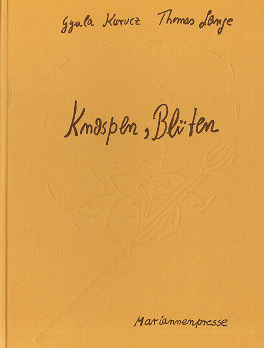 Mariannenpresse – Kurucz, Gyula, Knospen, Blüten. Mit 5 Orig.-Radierungen von Thomas Lange. Berlin 1990. 4°. 49, (5) S., OPp. mit blindgepr. Deckelillustration. Tadelloses Exemplar mit (nur minim. unfrischem) OUmschl. EA. * 52. Druck der Mariannenpresse. Eins von nur 20 (gesamt 100) nummer. Exemplaren der Vorzugsausgabe mit einer zusätzlich beiliegenden Orig.-Radierung, nummeriert u. von Lange signiert. Außerdem wurden nur in den Vorzugsexemplaren nicht nur der Druckvermerk von Kurucz u. Lange signiert, sondern auch alle Radierungen. – Satz der Texte aus der Mittel Times, gedruckt auf Bütten. Die Radierungen wurden in Dunkelbraun auf einen kräftigen Büttenkarton abgezogen.