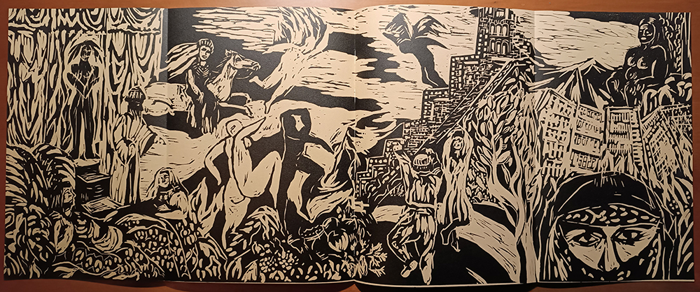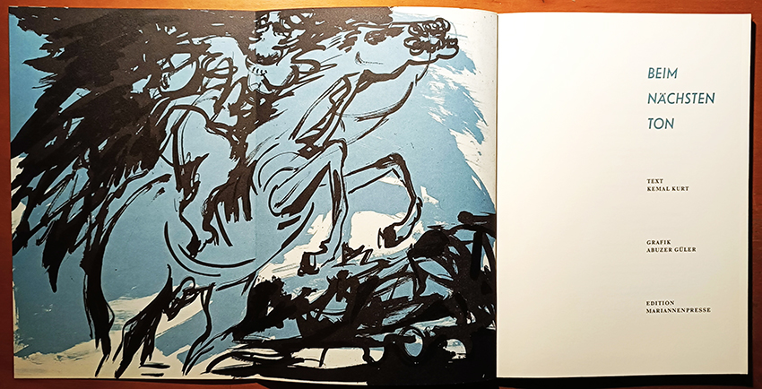 Kurt, Kemal, Beim nächsten Ton. Grafik von Abuzer Güler. Berlin (1988). Gr.-4°. 41, (3) S., illustr. OPappbd. mit aufgesetzten Deckeln. Sehr gutes Exemplar. Nicht mehr bei Spindler. * 48. Druck der Mariannenpresse. Eins von 200 numer. Exemplaren, von Autor u. Künstler signiert. – Die Gedichte wurden aus der Times halbfett gesetzt u. auf Bütten gedruckt. Insgesamt enthält der Band 11 Graphiken: 3 (davon 2 ganzseit., 1 doppelblattgr. gefalt.) Orig.-Offsetlithographien u. 8 Orig.-Linolschnitte, teils ganzseitig, 1 doppelblattgr., 1 über vier Seiten auf ausklappbaren Bögen aus feingeripptem, getöntem Büttenpapier.