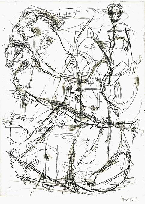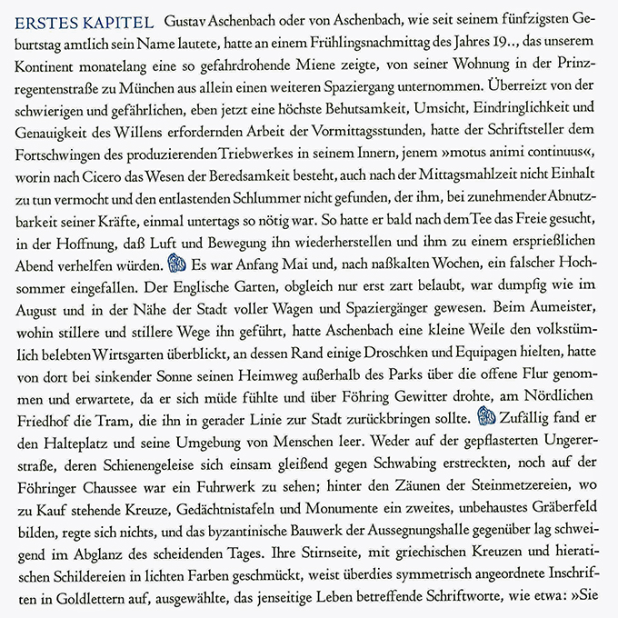 Mann, Thomas, Der Tod in Venedig. Mit einem einführenden Essay von Wolfgang Koeppen: Die Beschwörung der Liebe. Nachwort von Terence James Reed: Dichternöte – ein Spiel mit Leben und Tod. – Anhang: Textvarianten aus der früheren Fassung. Mit 8 signierten Original-Radierungen von Kurt Steinel. Unterreit 1993. 31,5 x 38,5 cm. 95, (5) S. u. 8 Graphikbl., Orig.-Ganzfranzband in Kassette. Der sehr empfindliche Überzugsstoff von Kassette u. Suitenmappe stellenw. gering abgegriffen, sonst tadellos. Jonas 93.142 (Koeppen). * Vierter Druck der Antinous Presse. Eins von 5 (ges. 95) numer. Exemplaren der Luxusausgabe in unikalem Meistereinband und mit Suitenmappe. – Jedes dieser fünf Exemplare wurde mit einem anderen Einband (Maroquinband mit Goldprägung, bemalter Pergamentband u.a.) versehen. Unser Exemplar ist das mit Abstand aufwändigste: Kurt Steinel schuf als Vorlage eigens für dieses Exemplar eine Gouache, die Roland Meuter als Mosaikeinband mit Lederauflagen in zehn verschiedenen Farben und mit Blindprägungen umgesetzt hat. Um die Farben des Entwurfes möglichst vorlagengetreu wiederzugeben, mußten die meisten Leder speziell eingefärbt werden. Zunächst wurde der Band in Ganzfranz-Technik in lavendelfarbenes Maroquin-Ziegenleder gebunden. Für sämtliche Dekorationselemente wurden Schablonen gefertigt, um die Intarsien bzw. Lederauflagen zuzuschneiden. Entstanden ist eine wunderschöne, abstrahierte Stadtkulisse Venedigs. Der Band ist mit Kopfgoldschnitt und handgestochenen französischen Kapitalen in drei Farben sowie mit lavendelfarbenen Velourlederspiegeln versehen. Signiert: „K. Steinel“ u. „R. Meuter, Ascona“. – In einer Kassette mit einem Überzugsstoff von Mariano Fortuny u. goldgeprägter Lederauflage auf dem Rücken der Kassette. Dazu eine ebenfalls mit Fortuny-Stoff überzogene Suitenmappe, enthaltend zusätzliche Abzüge sämtlicher acht Radierungen auf Bütten, jeweils numeriert u. signiert, eine Original-Bleistiftzeichnung von Kurt Steinel sowie eine Original-Kupferplatte in einem Passepartout. Die Platte wurde durch eine dezent geätzte Signatur entwertet, entgalvanisiert, eingefärbt und dann lackiert. – Der wertvolle Überzugsstoff wurde überwiegend in Handarbeit in Venedig hergestellt, als Motiv der venezianische Löwe, im Modeldruckverfahren in Goldbronze auf in Blautönen gefärbten Stoff gedruckt. – Druckvermerk mit Signaturen von Koeppen, Steinel u. Reed. Satz der Texte aus der Centaur-Antiqua u. der Arrighi, in Blau u. Schwarz auf Hahnemühle-Kupferdruckbütten gedruckt.