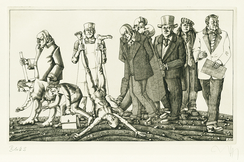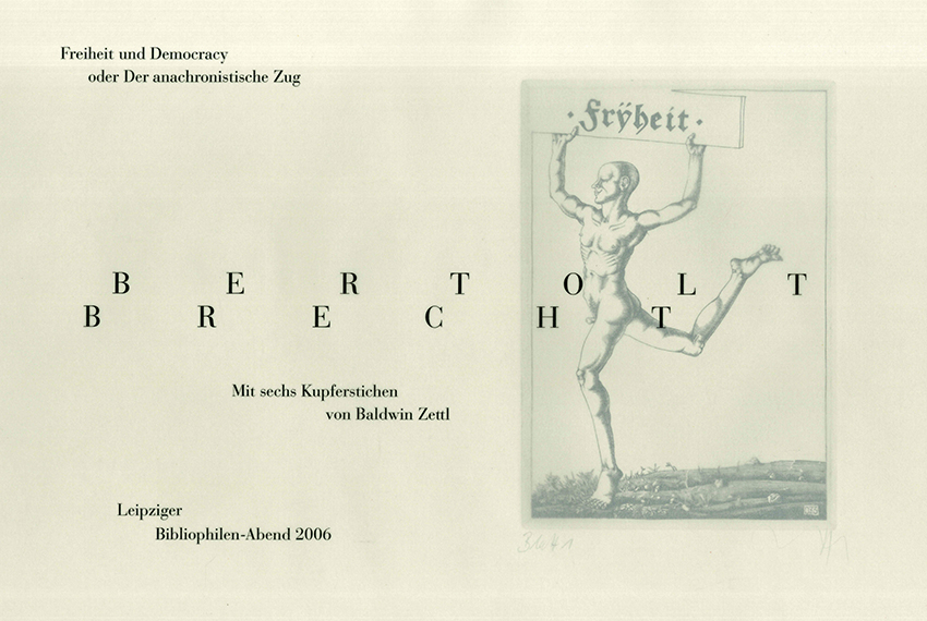 Brecht, Bertolt, Freiheit und Democracy oder Der anachronistische Zug. Mit sechs Orig.-Kupferstichen von Baldwin Zettl. Leipzig, Leipziger Bibliophilen-Abend 2006. 43,5 x 30,5 cm (quer). 1 rotes Deckblatt, 12 einseit. bedr. Textbl., 6 Graphikbl., in losen Bögen in Orig.-Pappmappe (zwei Ecken absolut minimal angestoßen). Sonst makelloses Exemplar. * 16. Leipziger Druck. Eins von 150 nummer. Exemplaren. Druckvermerk vom Gestalter der Mappe Gert Wunderlich signiert. Alle sechs Kupferstiche bezeichnet „Blatt 1“, „Blatt 2“… und vom Künstler signiert. – Die Texte wurden aus der Bodoni u. schmalfetten Maxima von André Grau von Hand gesetzt u. in Rot u. Schwarz auf Pergamentpapier gedruckt. Der Druck der Kupferstiche erfolgte durch den Künstler selbst auf kräftiges Somerset Velvet-Bütten. – Mit einer beiliegenden CD mit einer Aufnahme von Paul Dessaus Vertonung und Vortrag des Gedichtes.